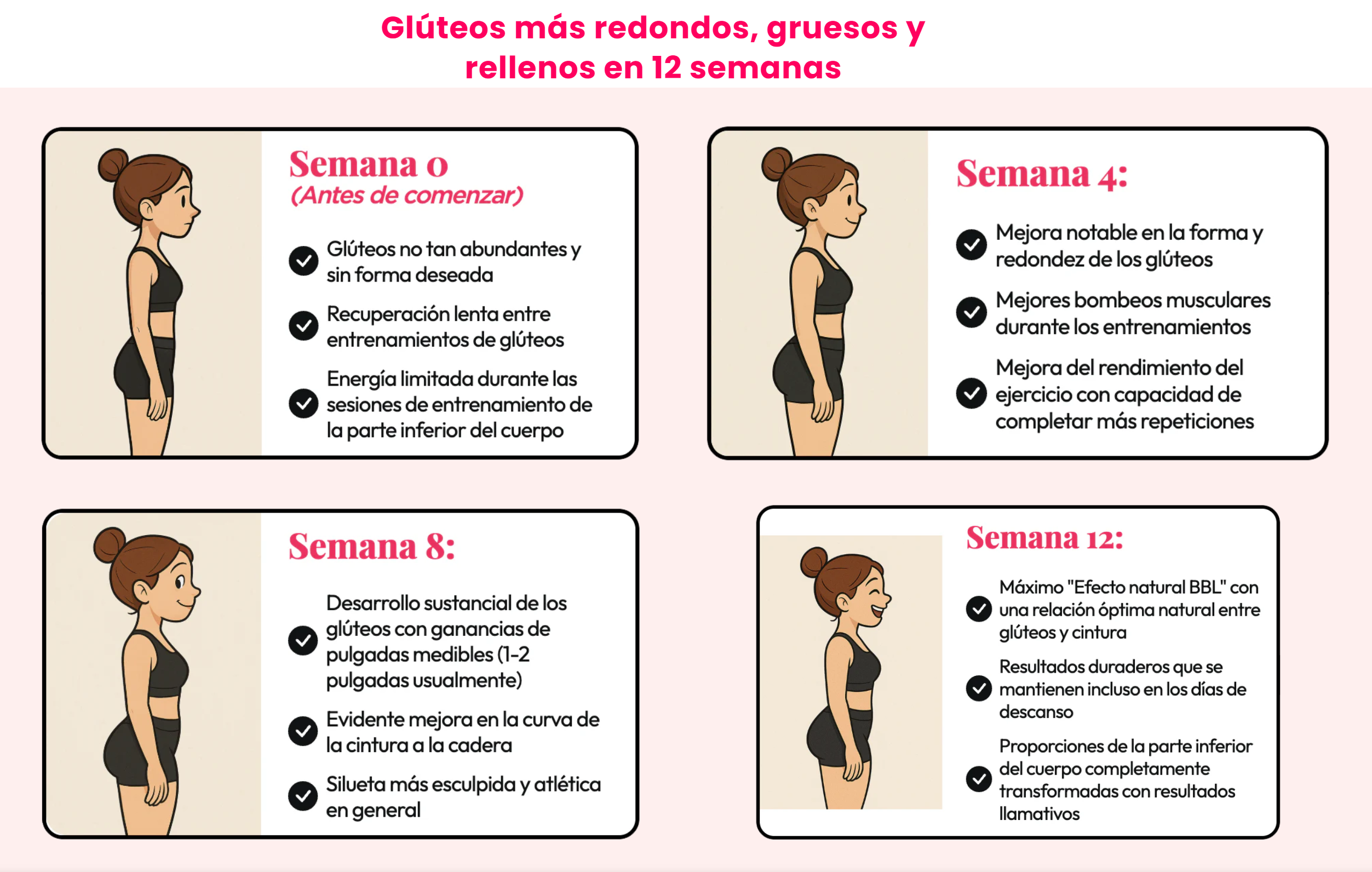“Después de 90 días, logré que mis glúteos crecieran y se vieran más redondos, algo que no conseguí con solo horas de gimnasio.” – Caroline J.