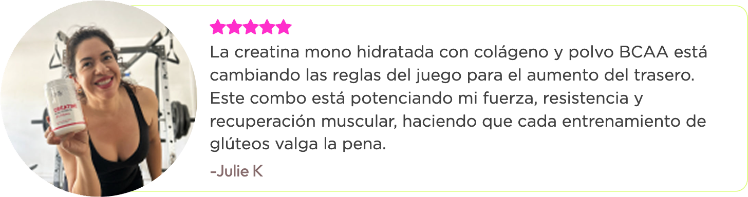“En solo 90 días pasé de glúteos planos a glúteos más redondos y firmes, incluso con mi trabajo exigente. ¡Los resultados se notan!” – Julie K.
